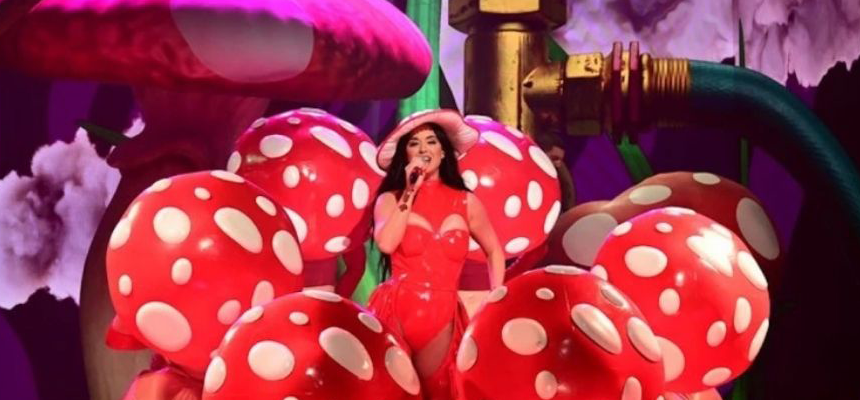 Já em “When I’m Gone (With Alesso)”, a artista contou com a presença de dançarinos, também vestidos de cogumelos, mantendo o tom divertido do cenário e mostrando a coreografia do single.